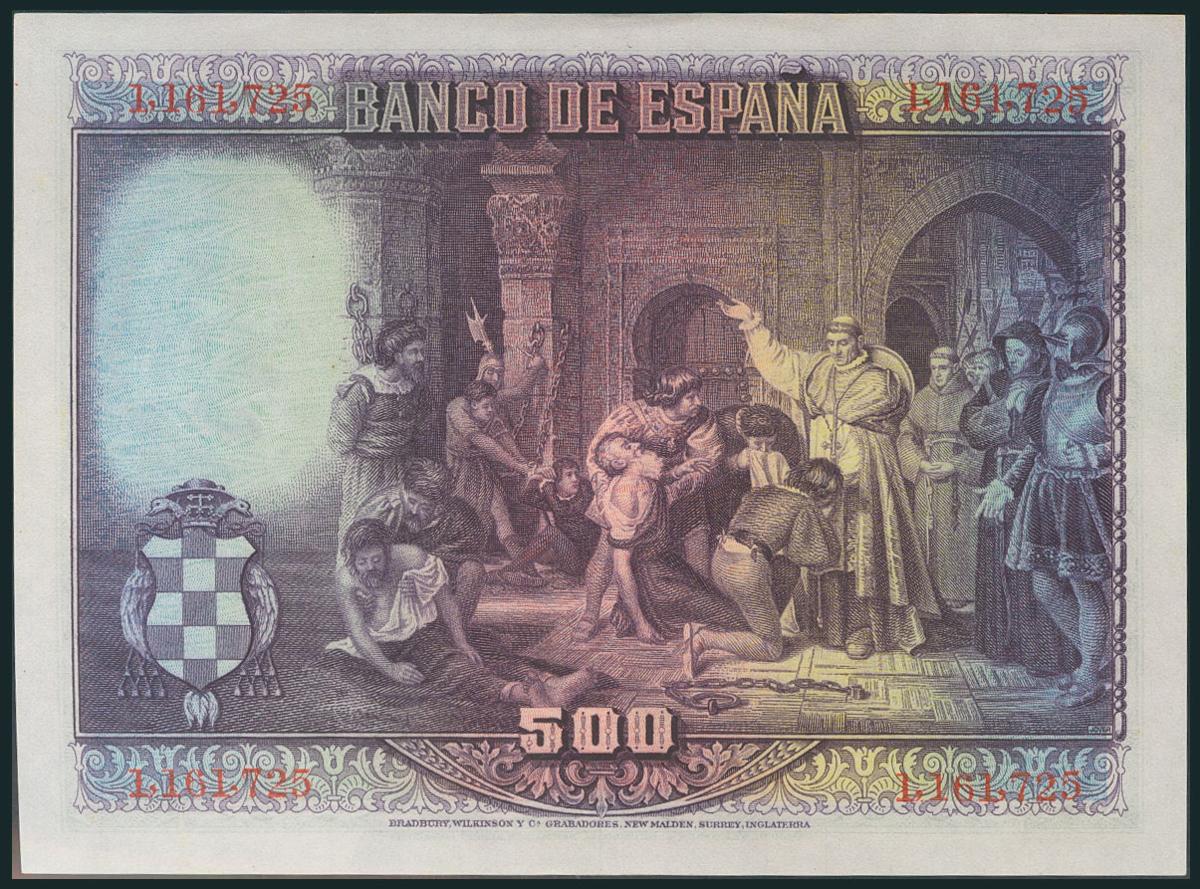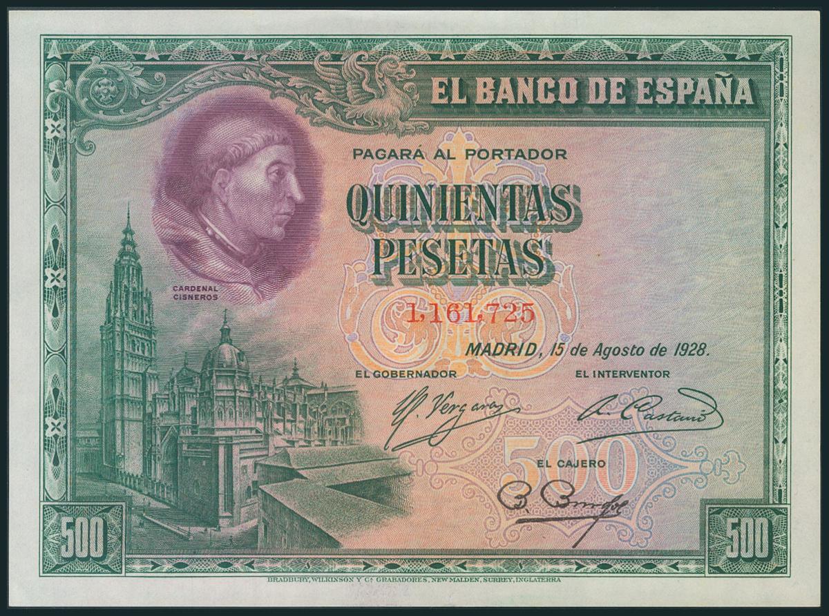 500 Pesetas. 15 de Agosto de 1928. Sin serie. (Edifil 2017: 356). Conserva gran parte del apresto original. EBC+.