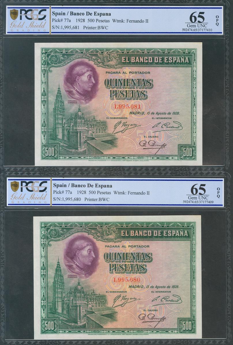500 Pesetas. 15 de Agosto de 1928. Pareja correlativa. Sin serie. (Edifil 2017: 356, Pick: 77a). Apresto original. Encapsulado ambos PCGS65OPQ. SC.