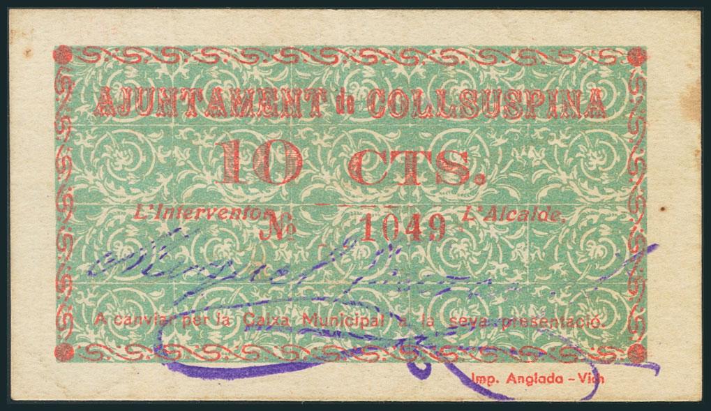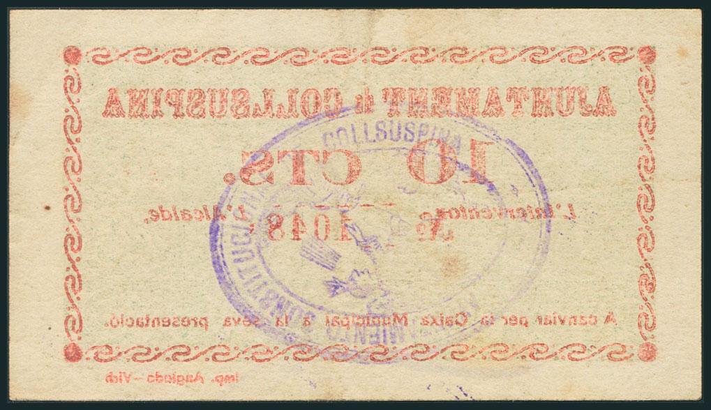 COLLSUSPINA (BARCELONA). 10 Céntimos. (1938ca). (González: 7645). Raro. MBC+.