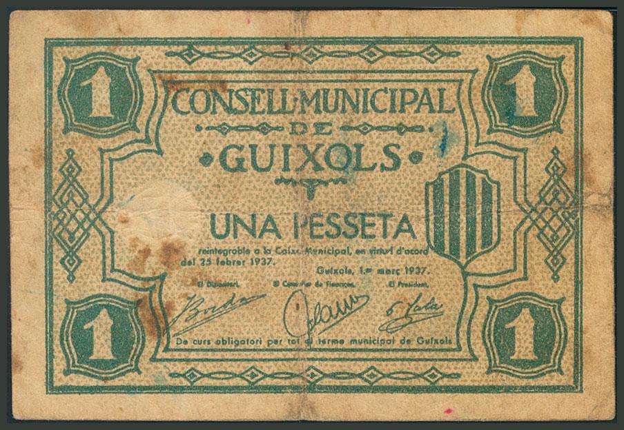 GUIXOLS (GERONA). 1 Peseta. 1 de Marzo de 1937. (González: 8182). BC.