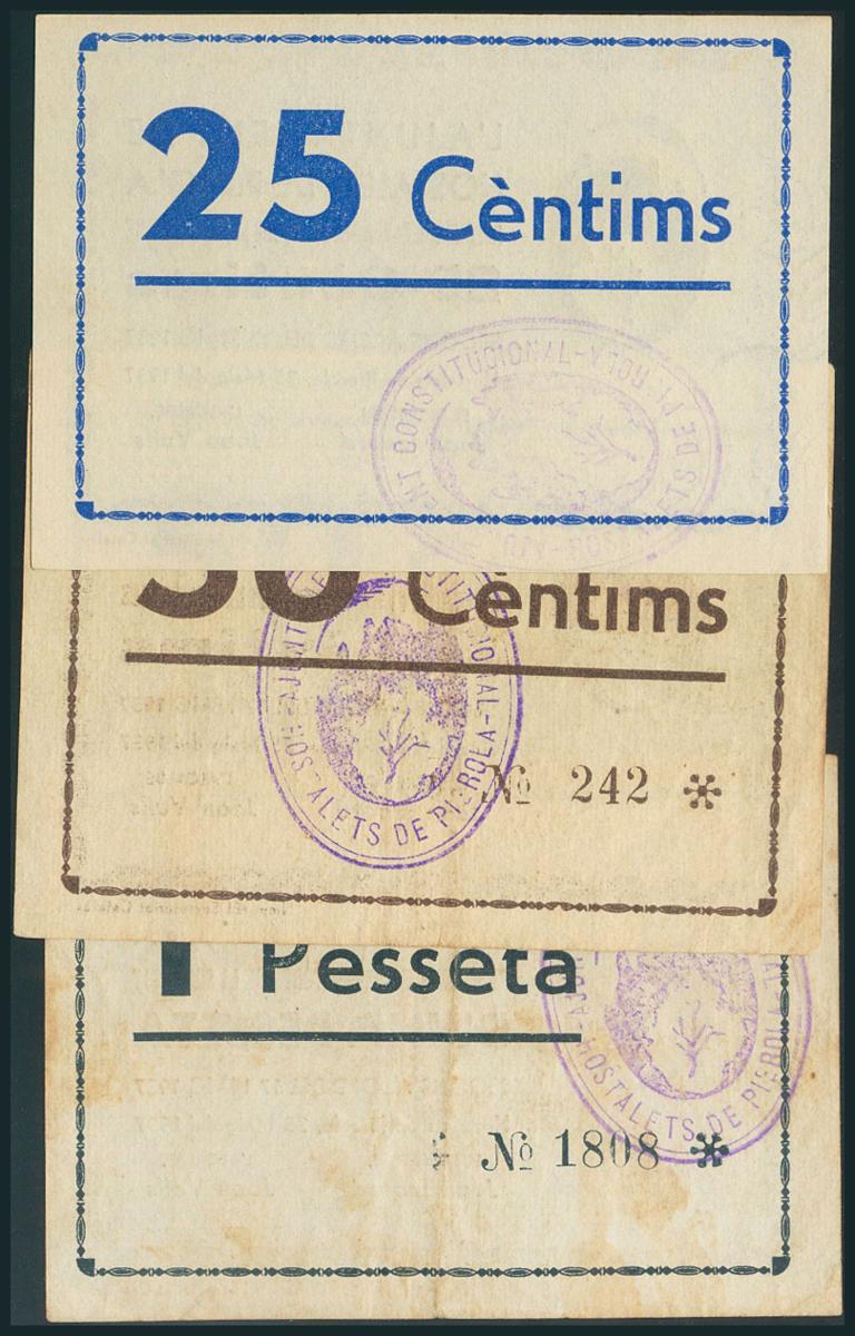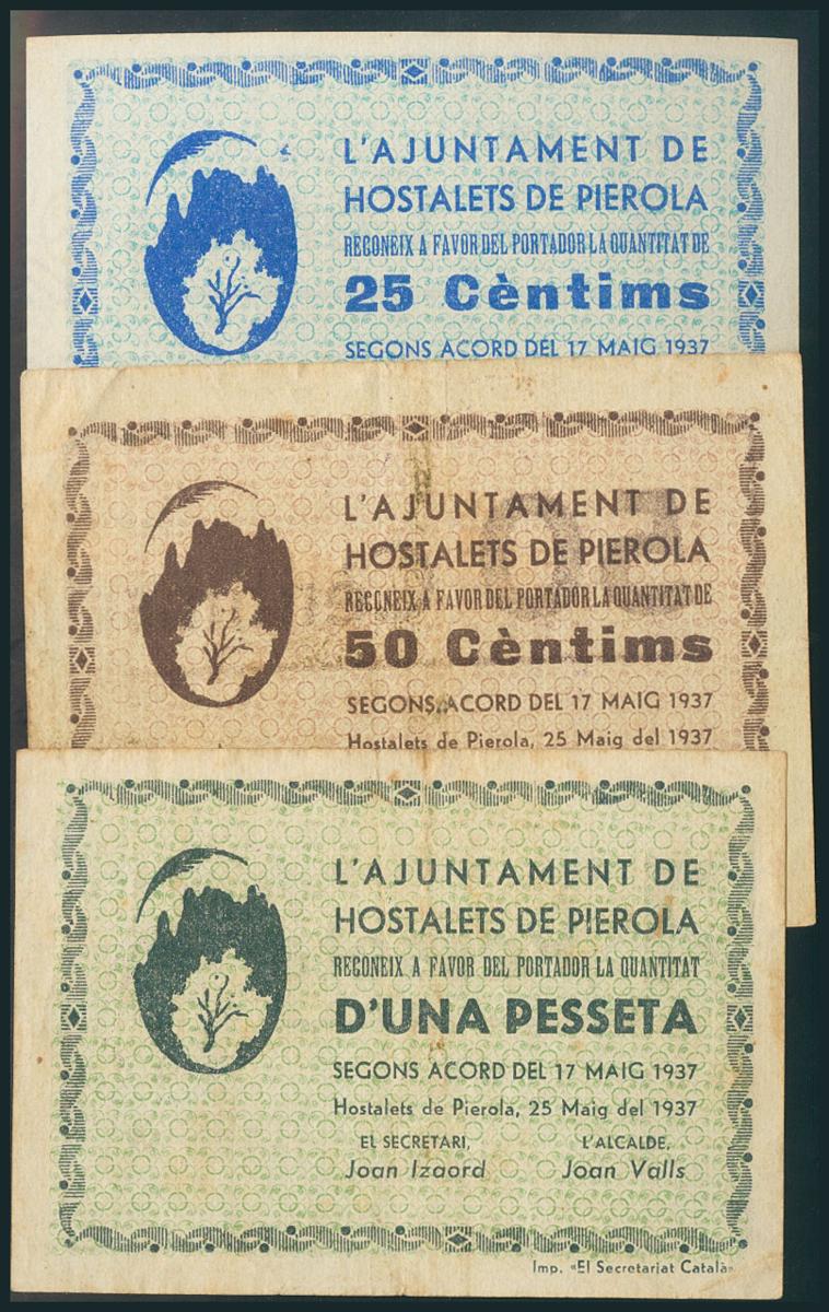 HOSTALETS DE PIEROLA (BARCELONA). 25 Céntimos, 50 Céntimos y 1 Peseta. Mayo 1937. El 25 cts sin numeración. (González: 8228/30). SC/MBC.