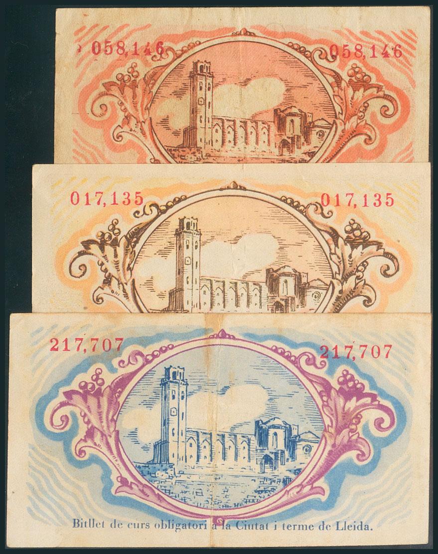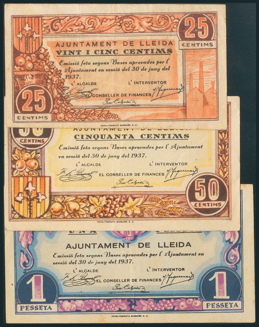LERIDA. 25 Céntimos, 50 Céntimos y 1 Peseta. 30 de Junio de 1937. (González: 8358/60). EBC/BC.