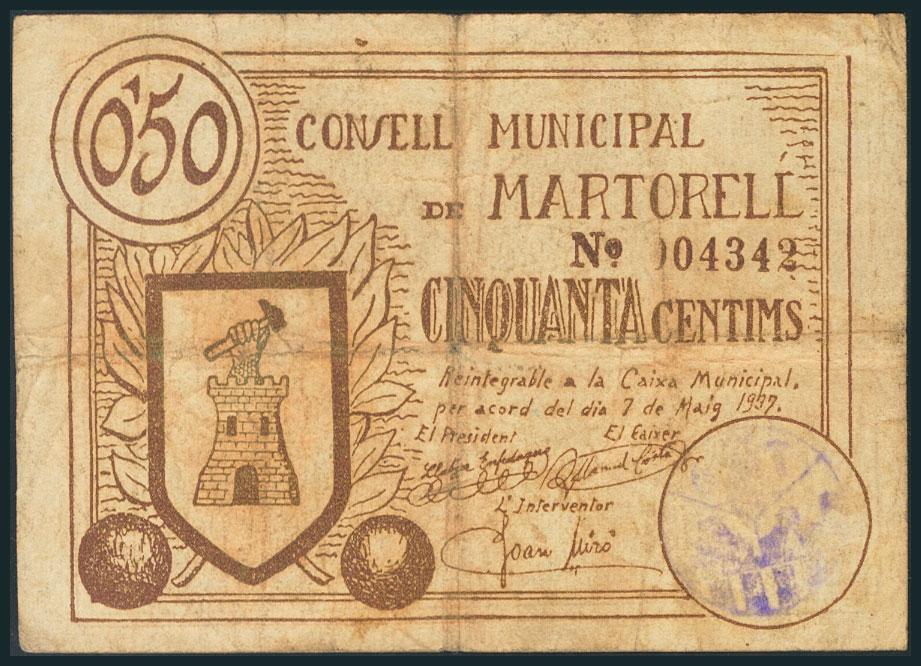 MARTORELL (BARCELONA). 50 Céntimos. 7 de Mayo de 1937. (González: 8578). MBC-.