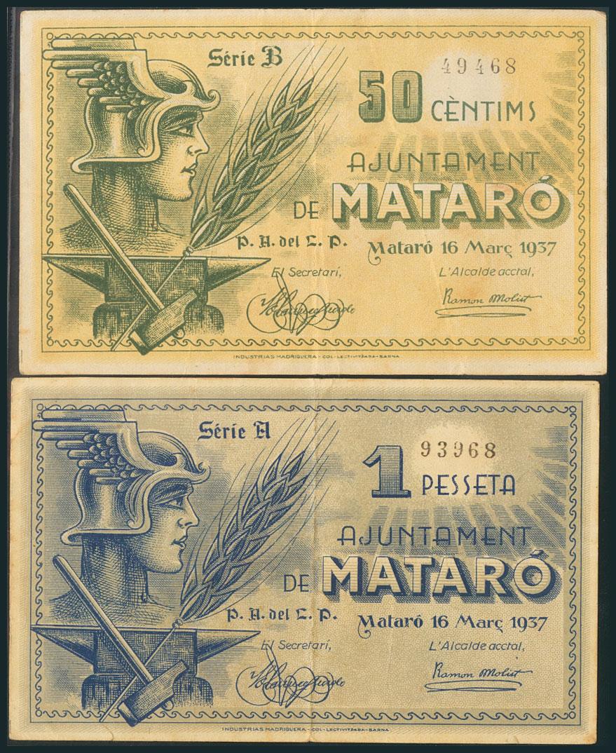 MATARO (BARCELONA). 50 Céntimos y 1 Peseta. 16 de Marzo de 1937. Series B y A, ambos. (González: 8658/59). EBC.
