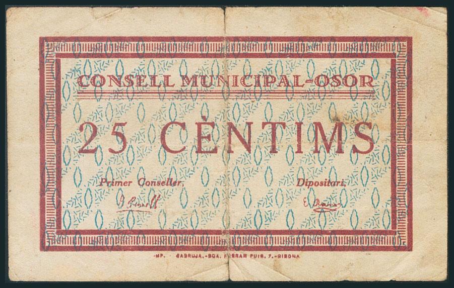 OSOR (GERONA). 25 Céntimos. (1938ca). (González: 9058). BC.