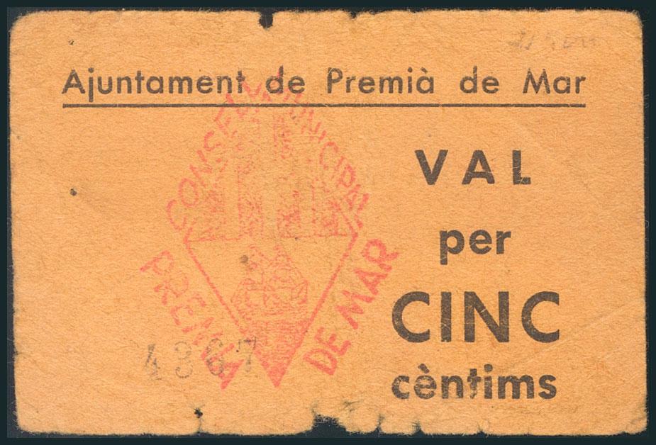PREMIA DE MAR (BARCELONA). 5 Céntimos. (1938ca). (González: 9466). Raro. RC.