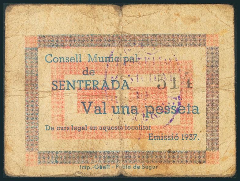 SENTERADA (LERIDA). 1 Peseta. 1937. (González: 9943). Muy raros. RC.
