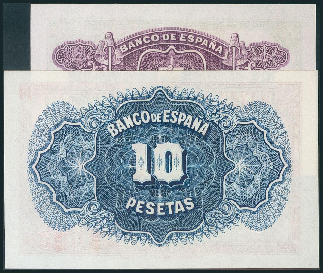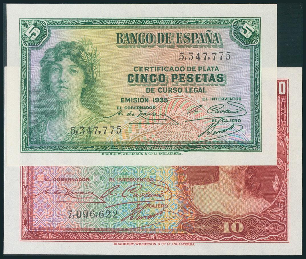 Conjunto de 2 billetes de 5 Pesetas y 10 Pesetas, emitidos en 1935 ambos sin serie (Edifil 2017: 363, 364). Apresto original. SC.