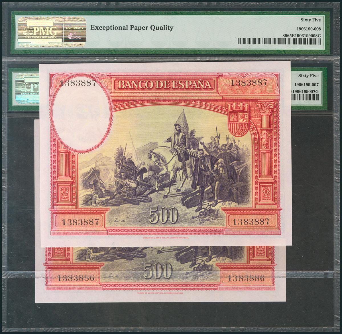500 Pesetas. 7 de Enero de 1935. Pareja correlativa. Sin serie. (Edifil 2017: 365). Apresto original. Raros en esta excepcional calidad. SC. Encapsulado PMG EPQ65, ambos.