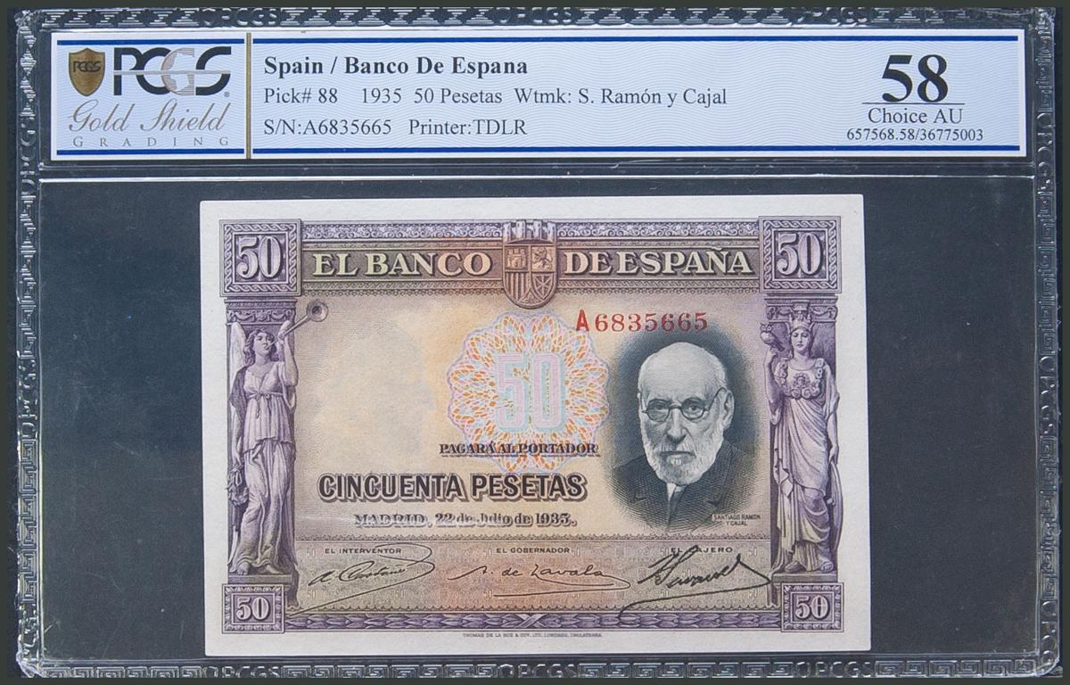 50 Pesetas. 22 de Julio de 1935. Serie A. (Edifil 2017: 366a y Pick: 88). Encapsulado PCGS58. EBC+.