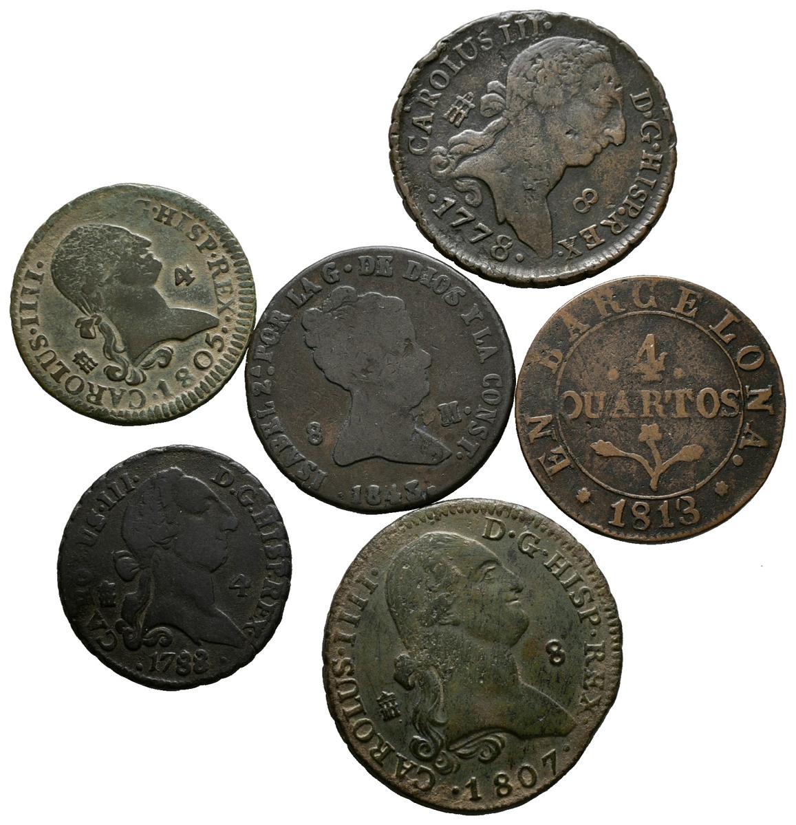 MONARQUIA ESPAÑOLA. Conjunto de 6 bonitos cobres de diferentes valores y reinados de los siglos XVIII y XIX. Diferentes estados de conservación. A EXAMINAR.