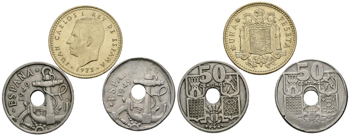 ERRORES Y VARIANTES. Conjunto de 3 piezas del Estado Español y Juan Carlos I con errores, destacando los 50 céntimos de 1949 con flechas invertidas. Diferentes estados de conservación. A EXAMINAR.