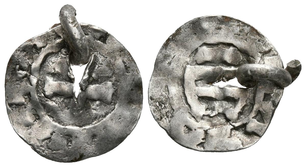 BISBE TEODORIC. Obolo de imitación carolingia. (904-937) Comtat de Barcelona. Cru.V.S. falta; Cru.C.G. 1811. Ar. 1,01g. Anilla de plata añadida, ¿ajuste de peso?. MBC. Rara