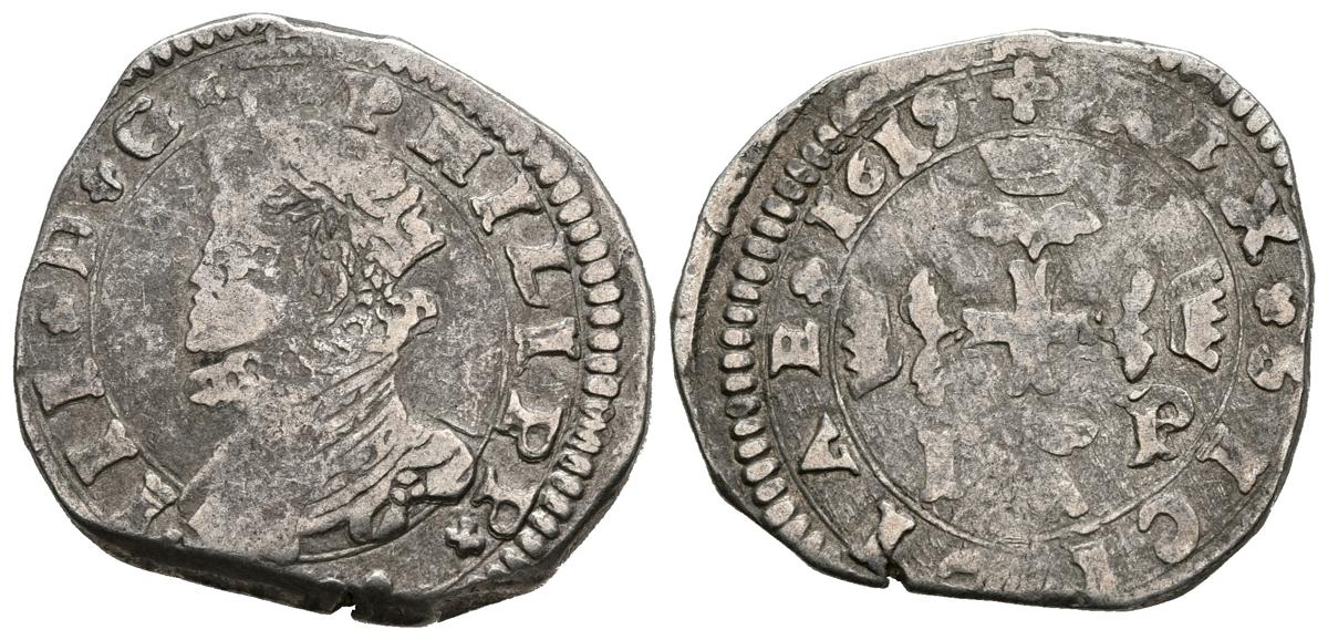 FELIPE III (1598-1621). 3 Taris (Ar. 7,79g/26mm). 1619. Messina IP. (Vti-121). MBC-.