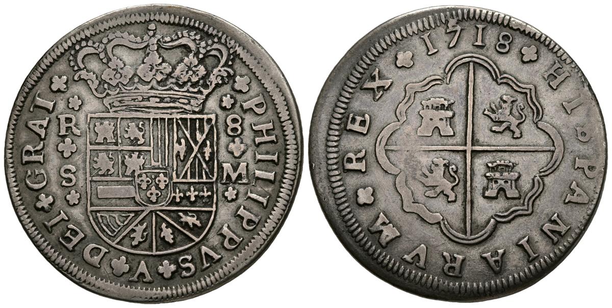 FELIPE V (1700-1746). 8 Reales. (Ar. 22,66g/41mm). 1718. Sevilla M. (Cal-2019-1617). MBC+. Vanos de acuñación en anverso reverso. Escasa.