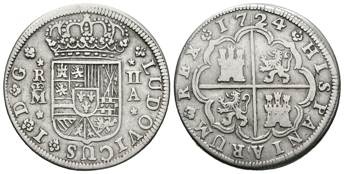 LUIS I (1724). 2 Reales. (Ar. 5,34g/28mm). 1724. Madrid A. (Cal-2019-20). MBC+/MBC. Escasa.