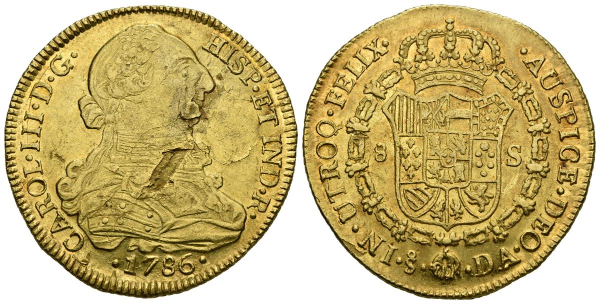 CARLOS III (1759-1788). 8 Escudos. (Au. 26,98g/37mm). 1786. Santiago DA. (Cal-2019-2174). MBC+/MBC. Hojas en anverso.