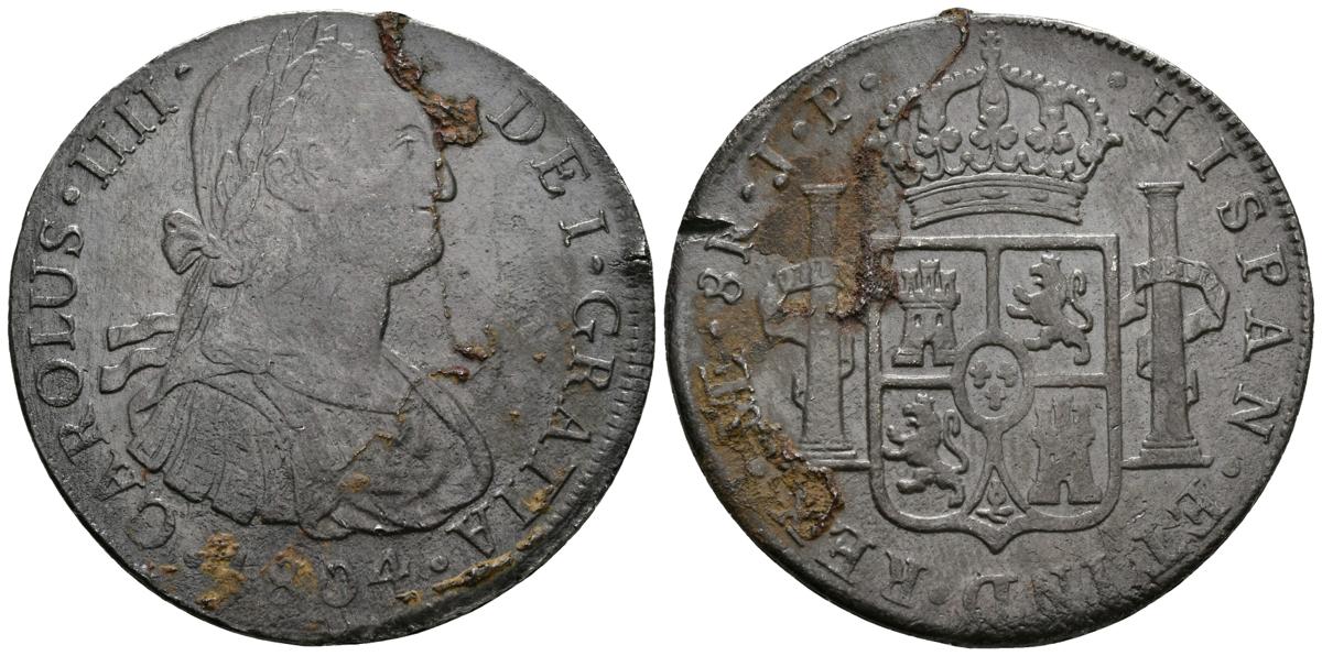 CARLOS IV (1788-1808). 8 Reales. (Ar. 26.82g/39.5mm).1804. Lima. (Cal-2019-924). Pátina oscura, depósitos y golpe en el canto. MBC.