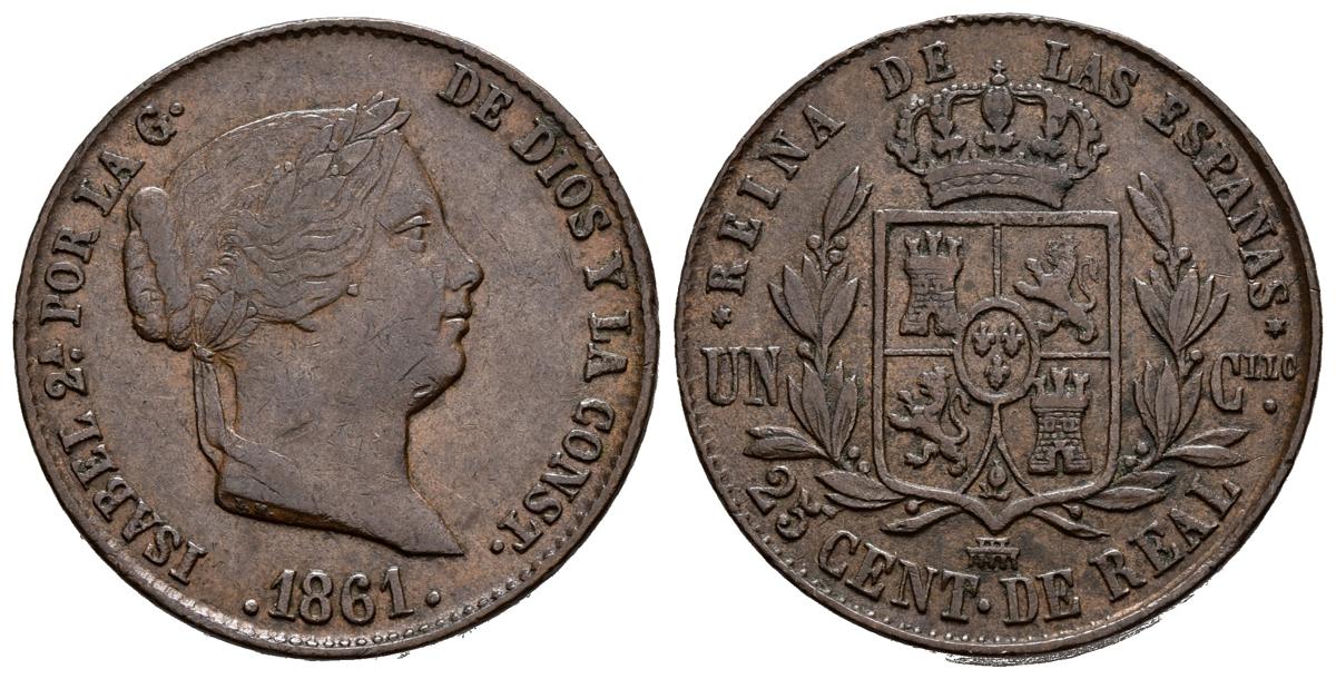 ISABEL II (1833-1868). 25 Céntimos de Real (Ae. 9,50g/27mm). 1861. Segovia. (Cal-2019-194). MBC+. Precioso tono.