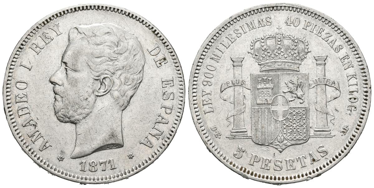 AMADEO I (1871-1873). 5 Pesetas. (Ar. 24,84g/37mm). 1871 *18-74. Madrid DEM. (Cal-2019-5). MBC+.
