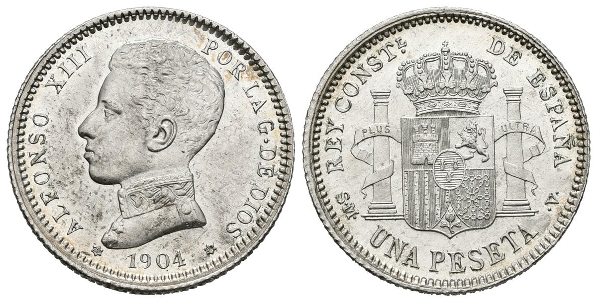 ALFONSO XIII (1885-1931). 1 Peseta. (Ar. 5,02g/23mm). 1904 *19-04. Madrid SMV. (Cal-2019-68). SC. Raro ejemplar en esta magnífica calidad.