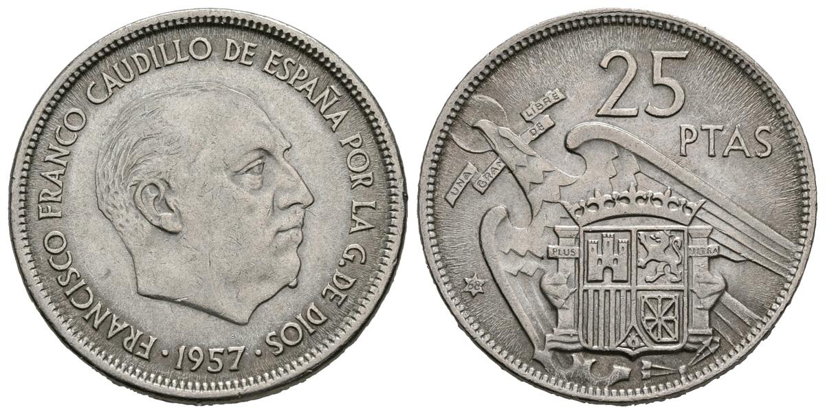 ESTADO ESPAÑOL. 25 Pesetas. (CuNi. 8,70g/27mm). 1957 *68. Madrid. (Cal-2019-123). Variante: Exceso de metal en barbilla. MBC+.