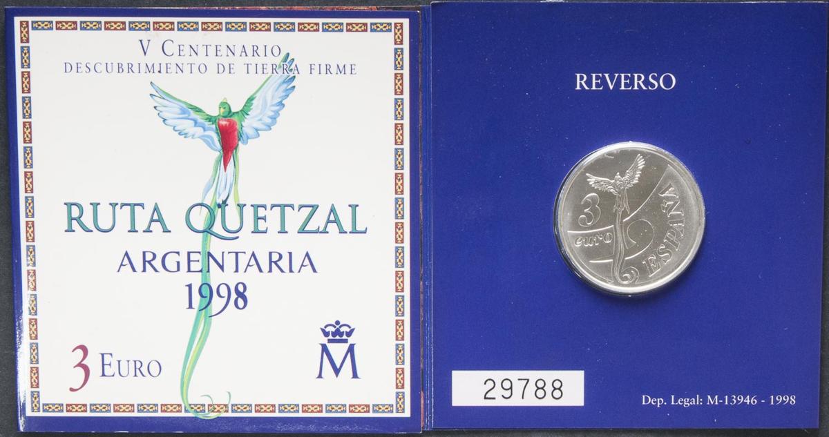 JUAN CARLOS I. 3 Euro. (Ar. 20,00g/33mm). 1998. "RUTA QUEZTAL". Presentada en estuche oficial con certificado. PROOF.