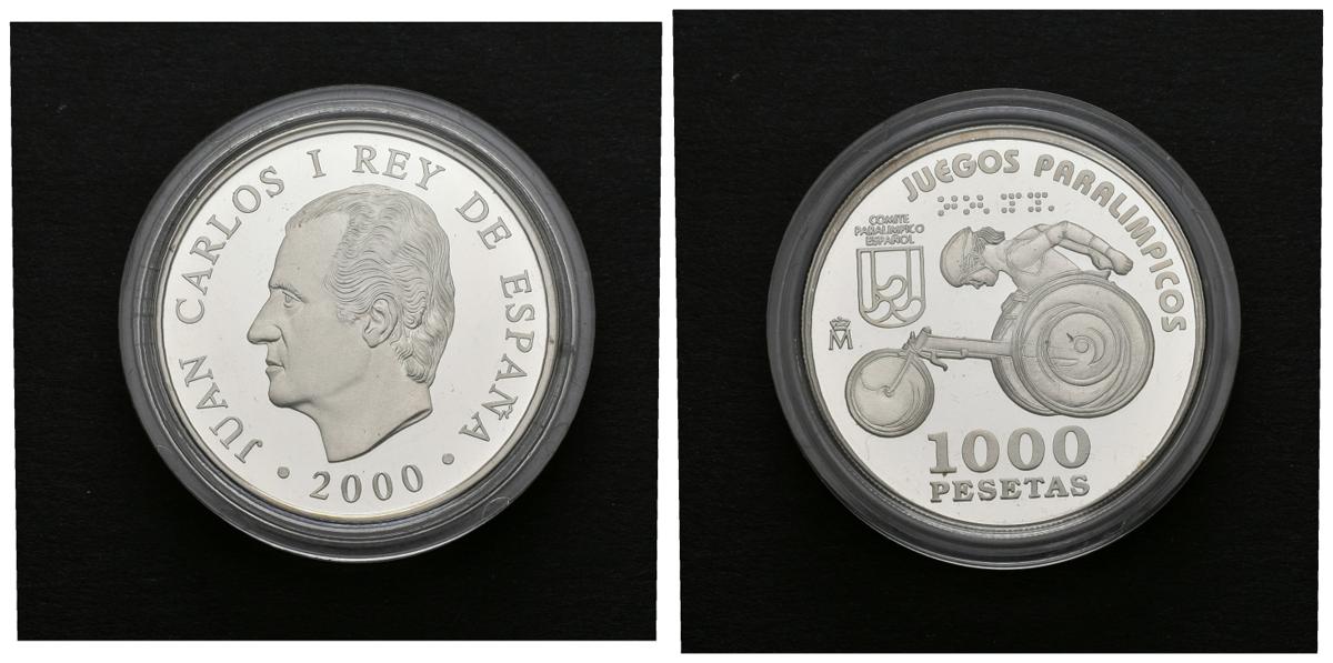 JUAN CARLOS I. 1000 Pesetas. (Ar. 13,50g/33mm). 2000. "JUEGOS PARALIMPICOS 2000 (Silla de ruedas)". PROOF. Presentada en estuche oficial con certificado.