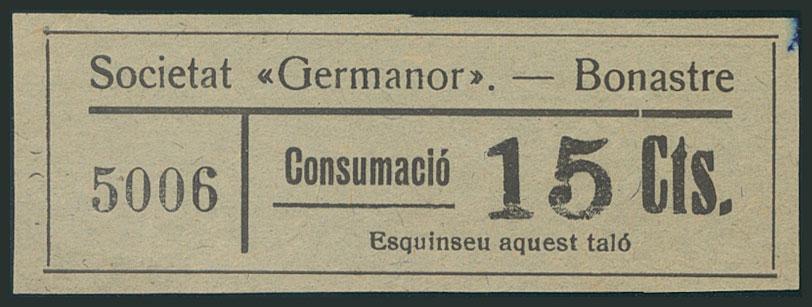 Voucher of 15 Cents from the Societat Germanor de Bonastre. AU.