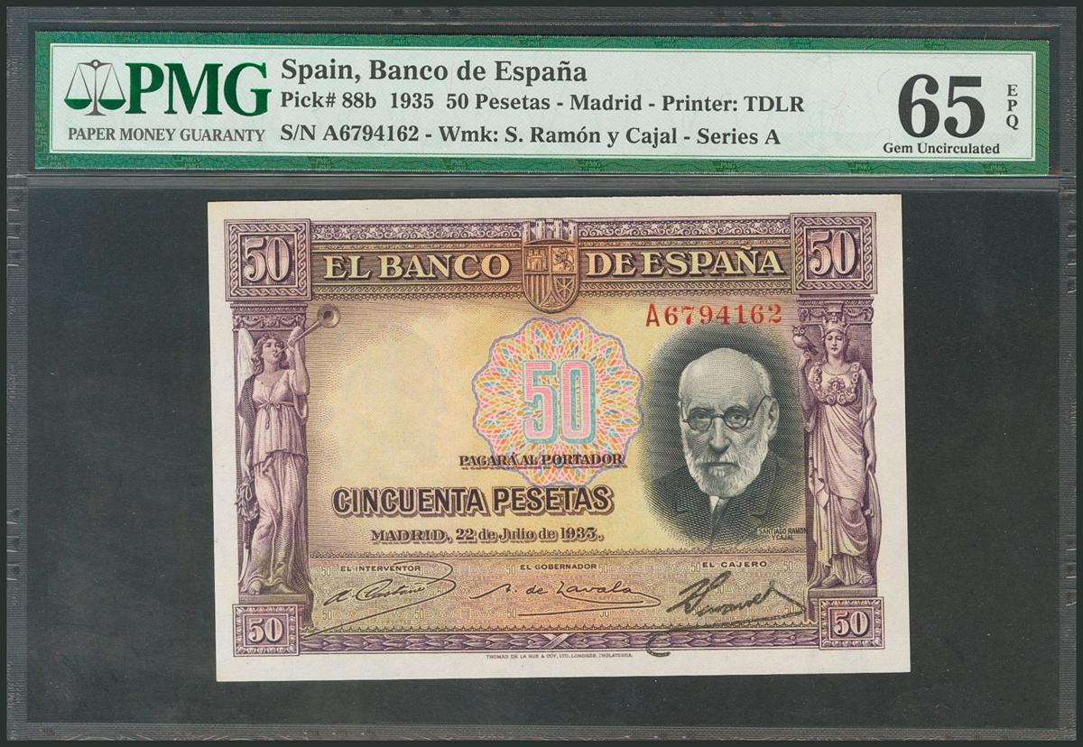 50 Pesetas. July 22, 1935. Series A. (Edifil 2017: 366a). PMG65EPQ package. UNC.