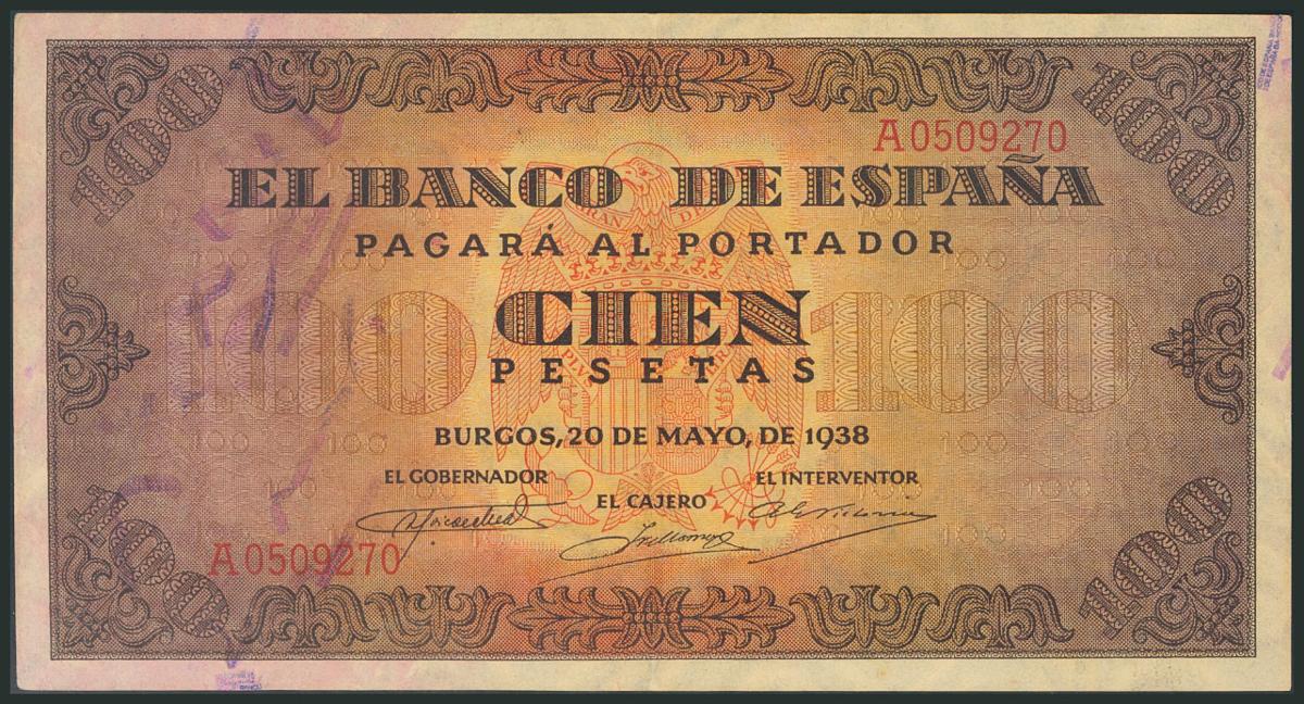 English 100 Pesetas. May 20, 1938. Series A. (Edifil 2017: 432). Preserving much of the original size. AU.