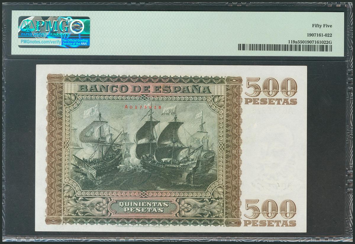 500 pesetas. January 9, 1940. Series A. (Edifil 2017: 439). Weird like that. AU. PMG55 package.