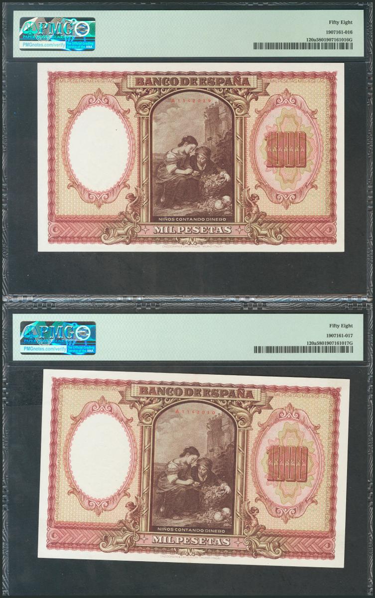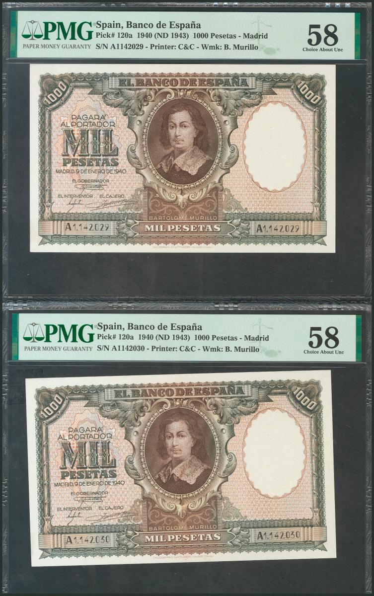 1000 Pesetas. January 9, 1940. Correlative pair. Series A. (Edifil 2017: 440). Very slight vertical fold (in one of the bills it is practically invisible), both bills retain all their original size. Very rare in this conservation. AU. Encapsulated PMG58, both. (To get an idea of the rarity of the banknote in this quality, PMG grants on September 1, 2020 the third highest quality to this banknote along with nine more banknotes, and only surpassed by two banknotes that graduated from 58EPQ and 64 , respectively).