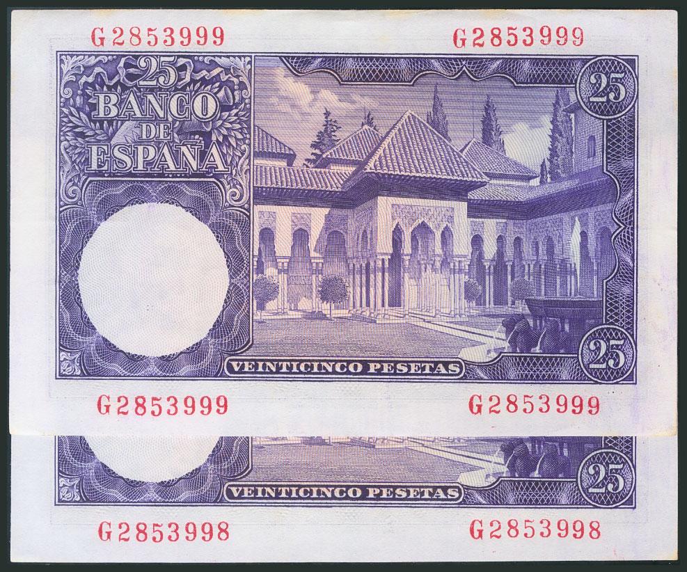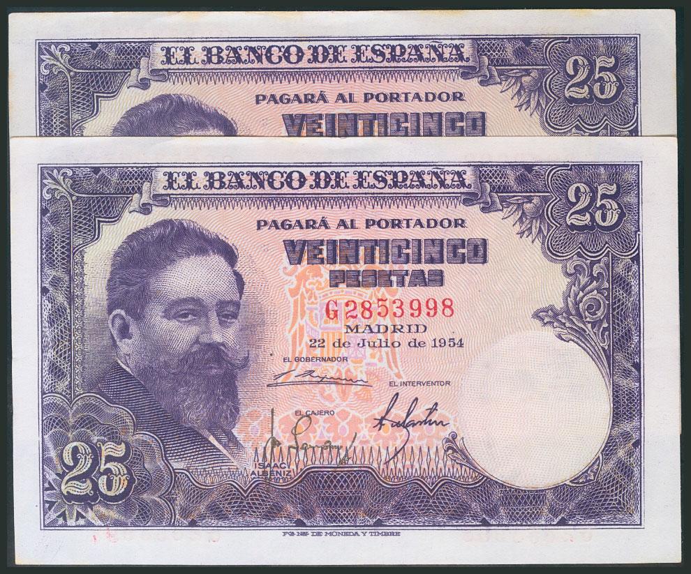 25 pesetas. July 22, 1954. Correlative couple. Series G. (Edifil 2017: 467a). XF.