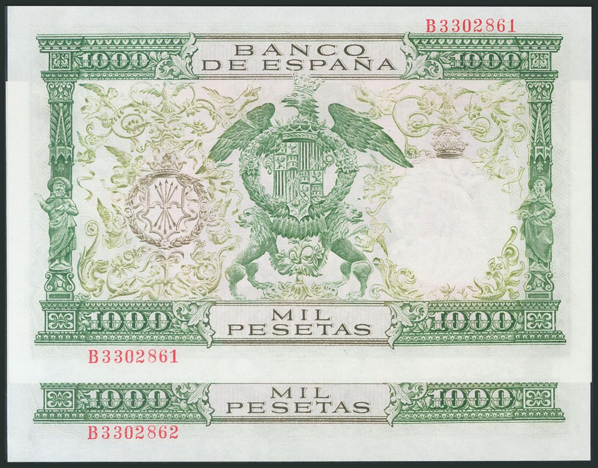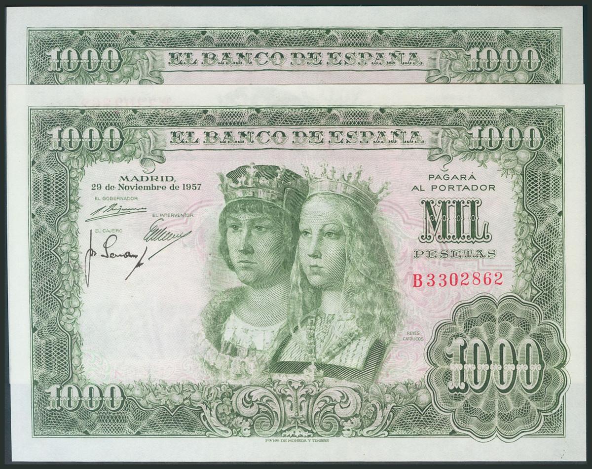 1000 Pesetas. November 29, 1957. Correlative pair. Series B. (Edifil 2017: 469b). UNC.