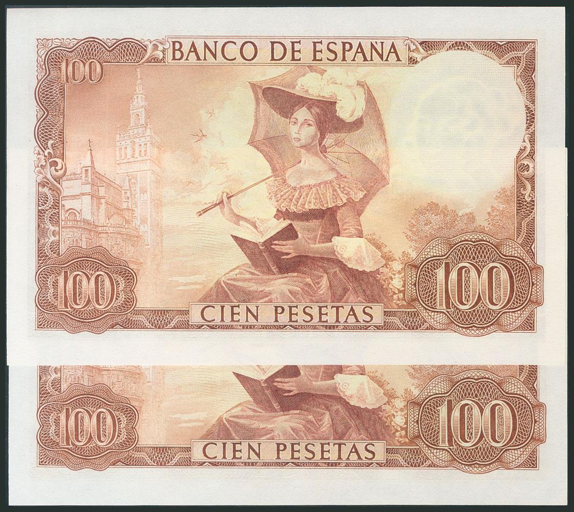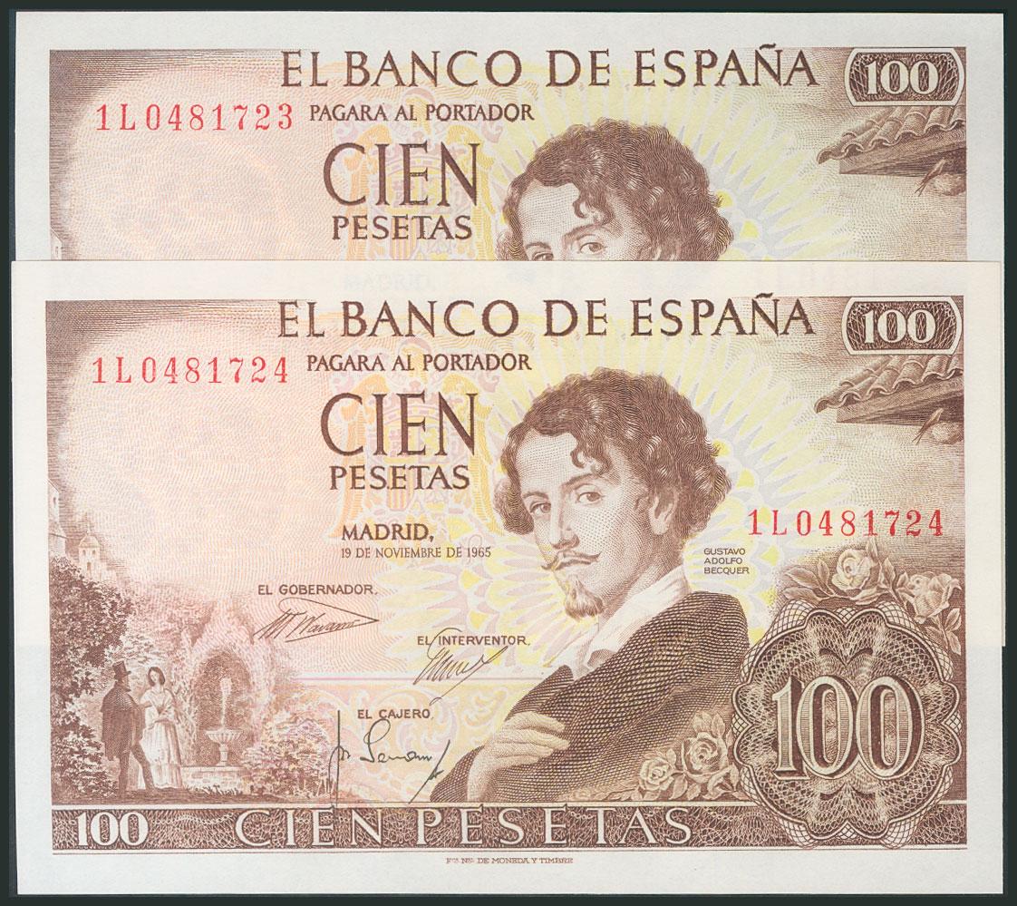 100 Pesetas. November 19, 1965. Correlative couple. Series 1L. (Edifil 2017: 470a). UNC/ UNC.