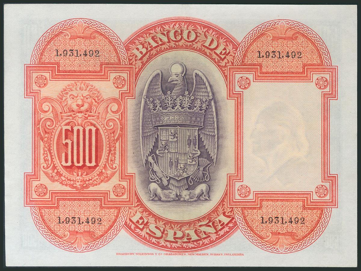 500 pesetas. July 24, 1927. Without series and with the number after 1,602,000. (Edifil 2017: 352). Expertly ironed in the central fold, giving it a spectacular appearance and much superior to the real conservation, with a very flat finish and lack of liveliness. VF, in its original condition.