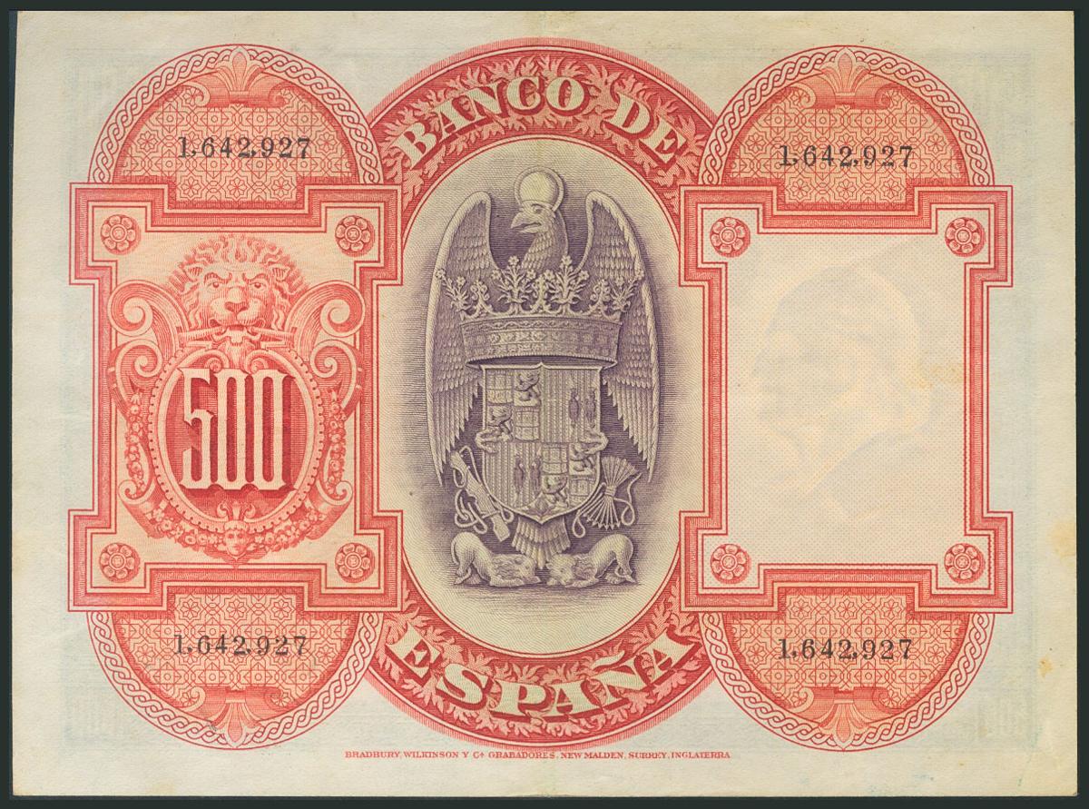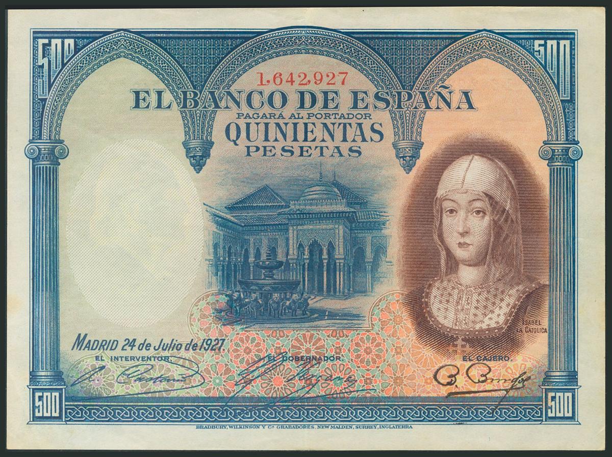 500 pesetas. July 24, 1927. No series and numbering after 1602000. (Edifil 2017: 352). F.
