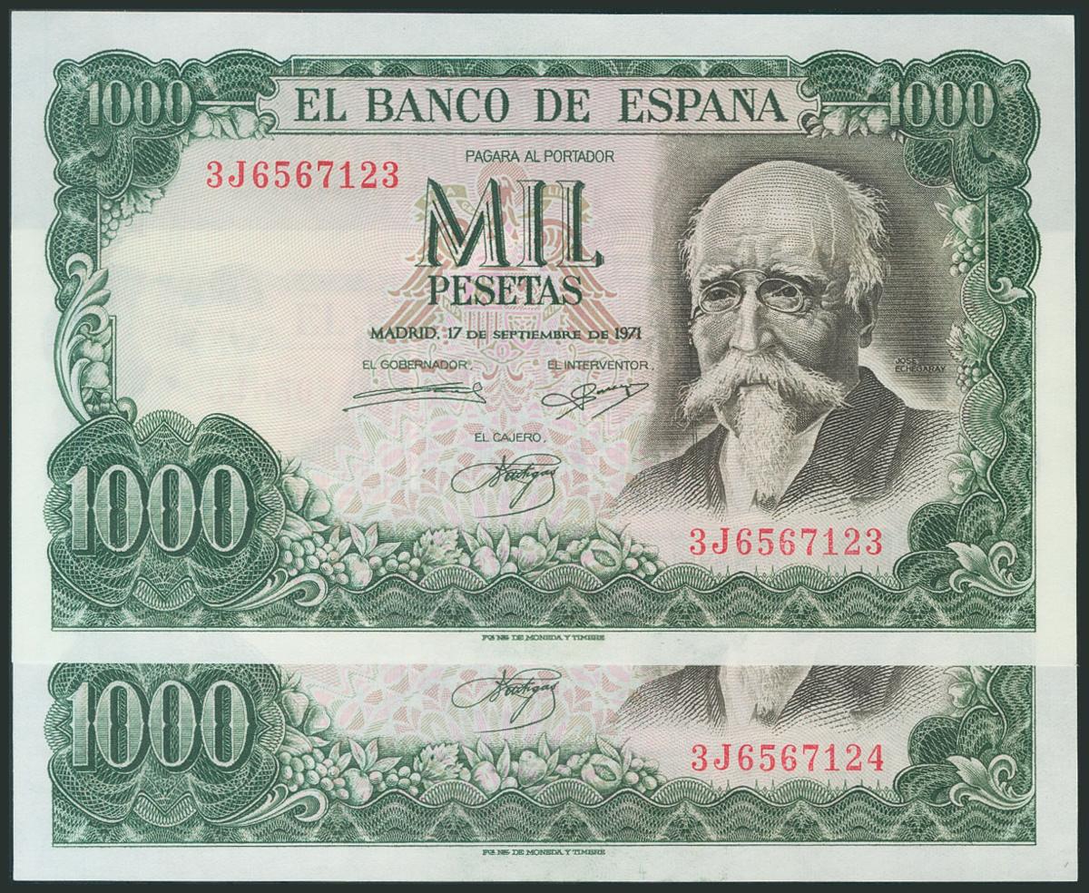 1000 Pesetas. September 17, 1971. Correlative pair. 3J series. (Edifil 2017: 474c). UNC.