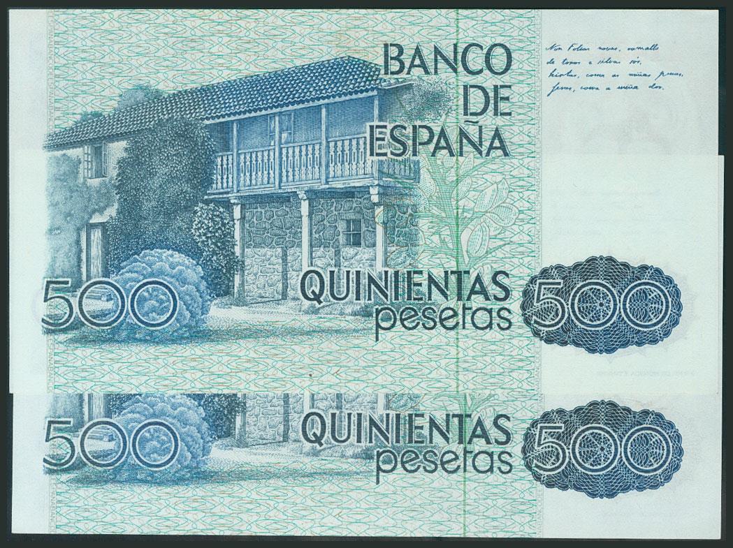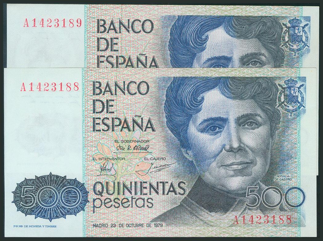 500 pesetas. October 23, 1979. Correlative couple. Series A. (Edifil 2017: 476a). UNC.