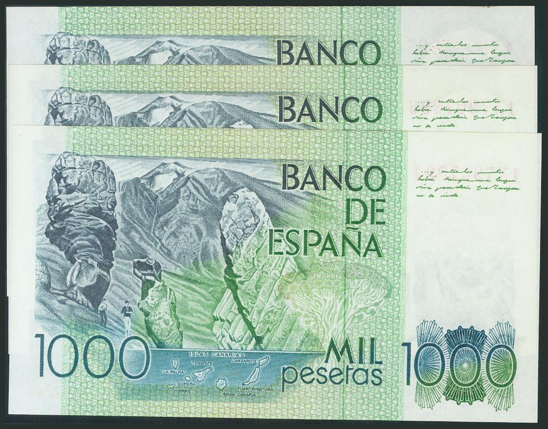 1000 Pesetas. October 23, 1979. Correlative trio. 1X series. (Edifil 2017: 477a). UNC.