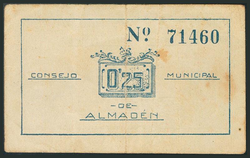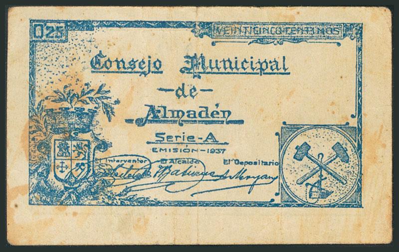 English ALMADEN (CIUDAD REAL). 25 cents. 1937. Series A. (González: 535). F.