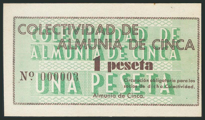 ALMUNIA DE CINCA (HUESCA). 1 peseta. (1938ca). Very low numbering. (González: 630). Rare. AU.