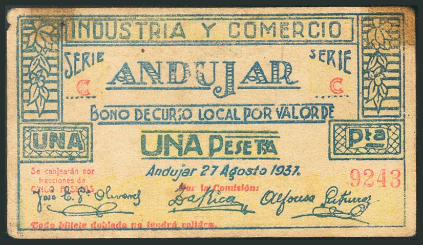 English ANDUJAR (JAEN). 1 peseta. August 27, 1937. Series C. (González: 701). G.