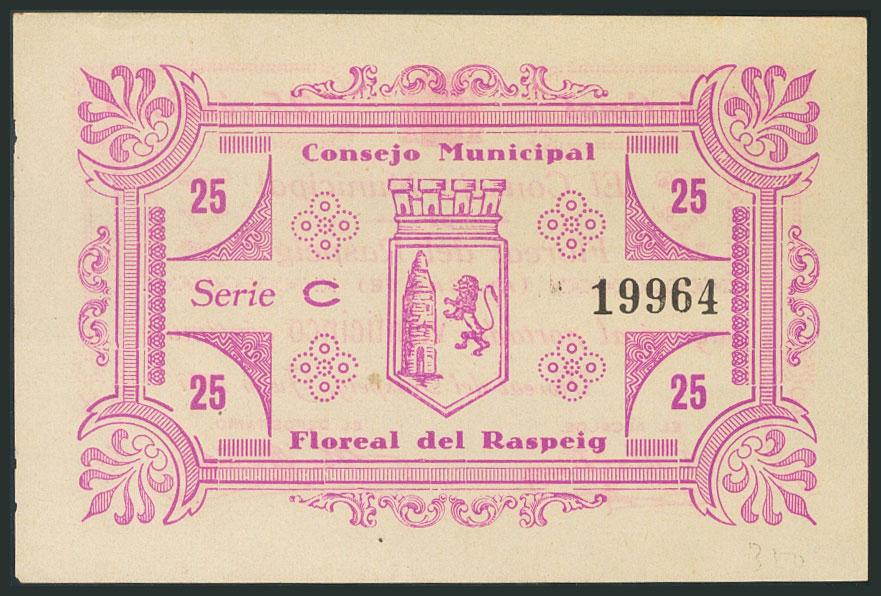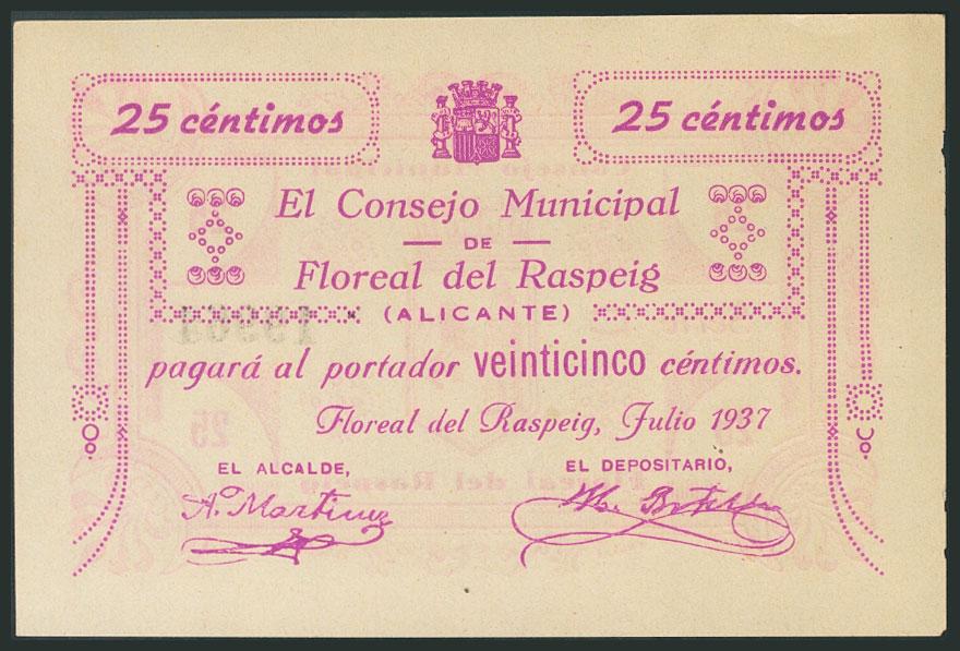 FLOREAL DEL RASPEIG (ALICANTE). 25 cents. July 1937. Series C. (González: 2461). AU.