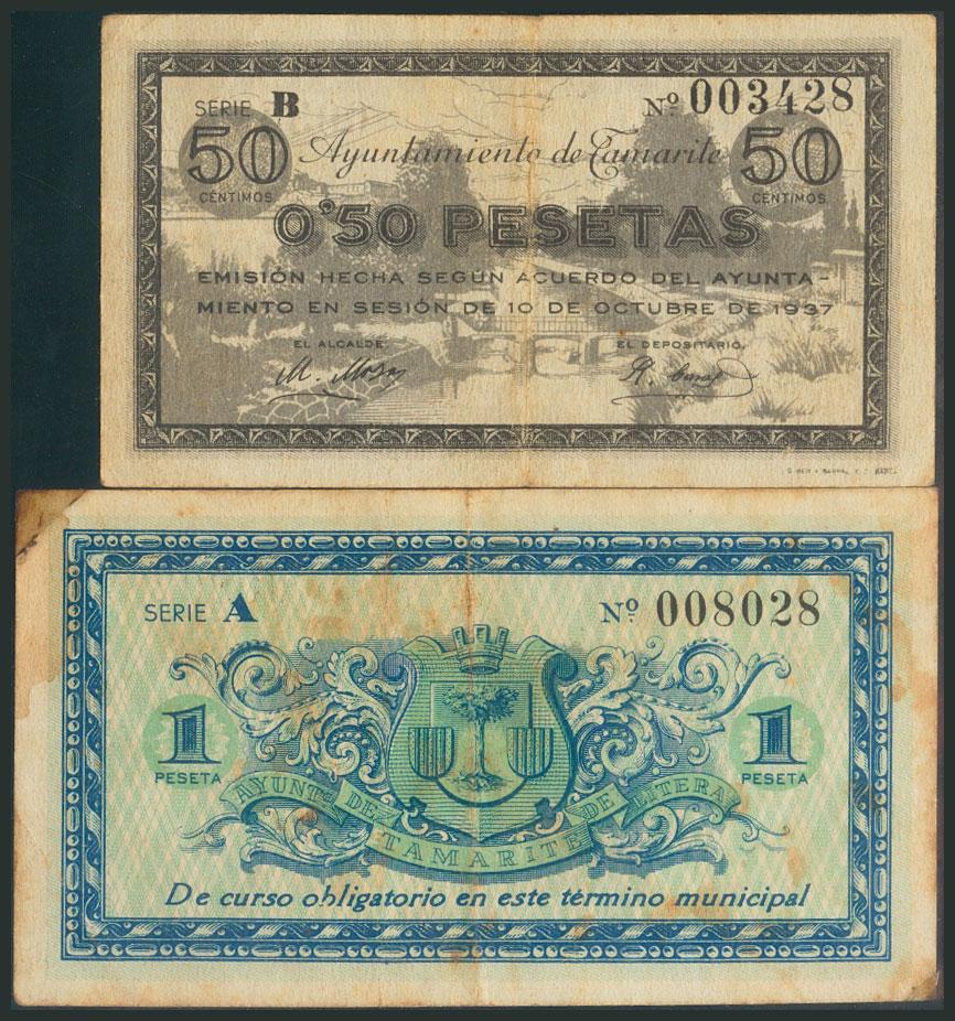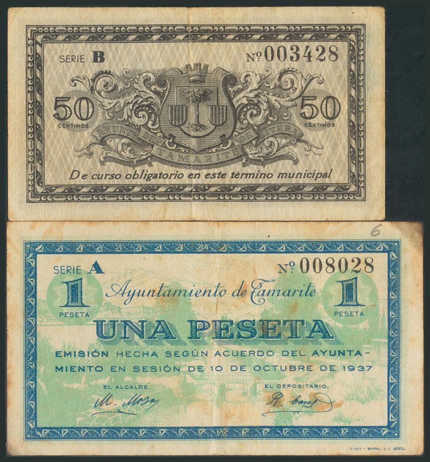 TAMARITE DE LITERA (HUESCA). 50 Cents and 1 Peseta. October 10, 1937. Series B and A, respectively. (González: 4973, 4974). F.