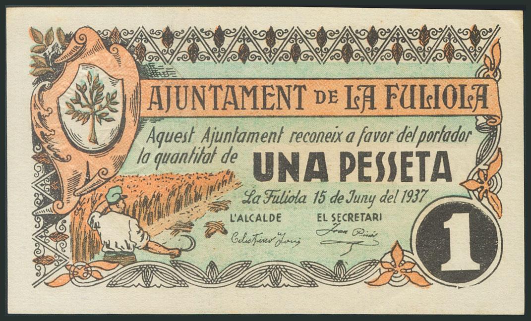 English LA FULIOLA (LERIDA). 1 peseta. June 15, 1937. (González: 7943). AU.