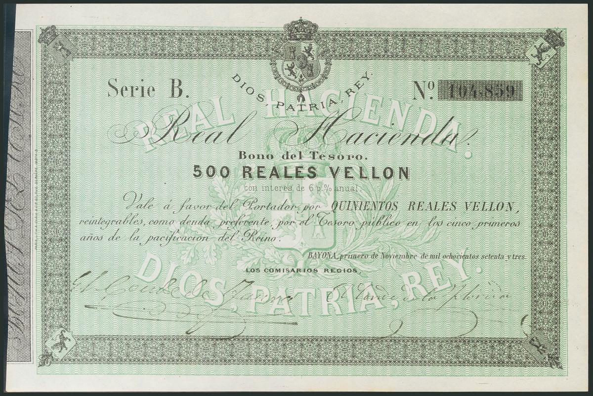 500 Reais. November 1, 1873. Series B. (Edifil 2017: 211). UNC.