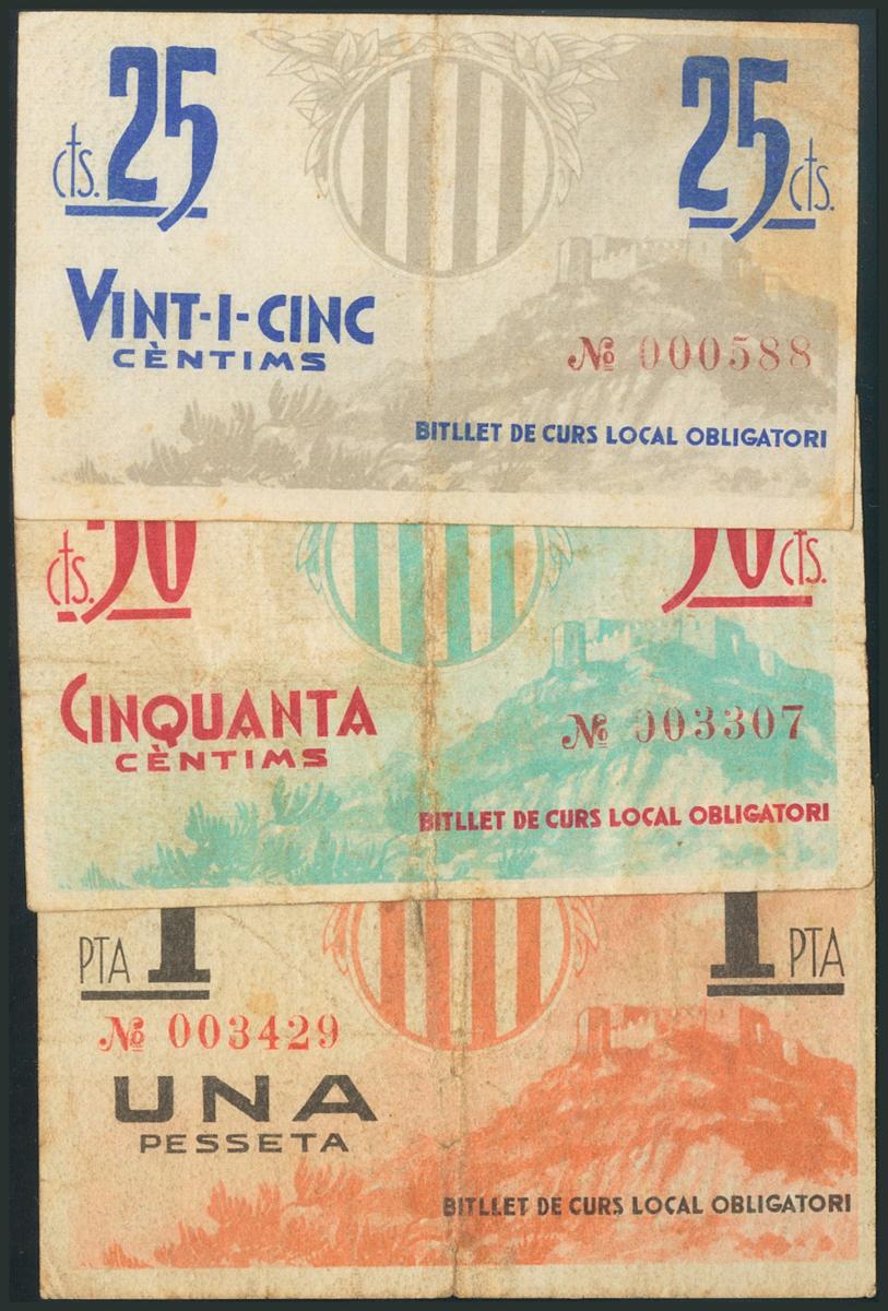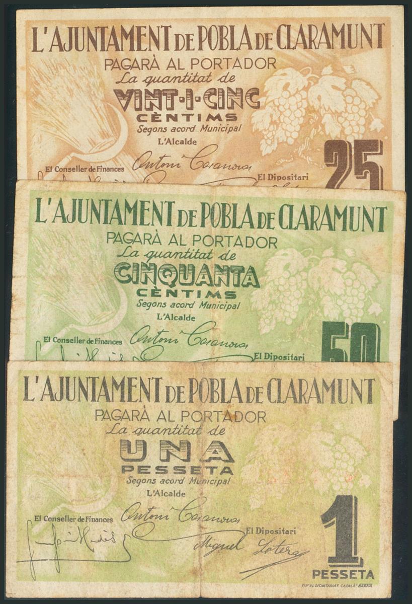 English POBLA DE CLARAMUNT (BARCELONA). 25 Cents, 50 Cents and 1 Peseta. (1938ca). (González: 9312/14). F.