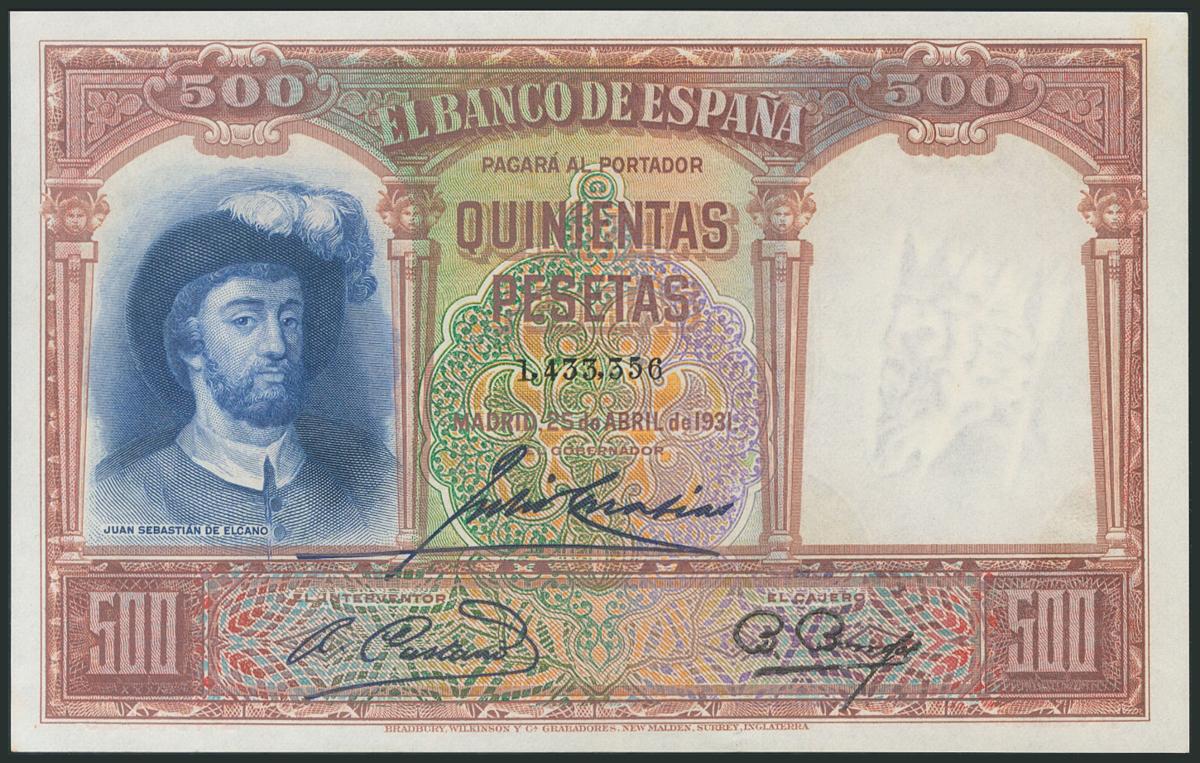 500 pesetas. April 25, 1931. Without series. (Edifil 2017: 361). Original sizing. UNC.